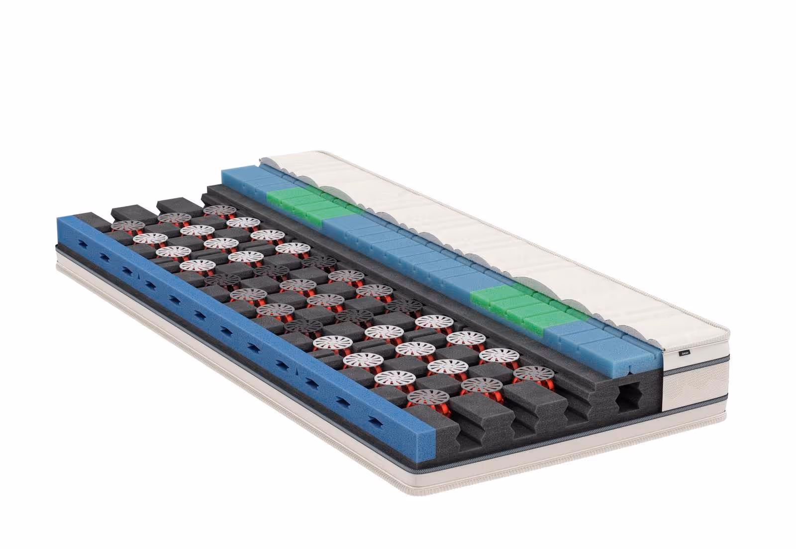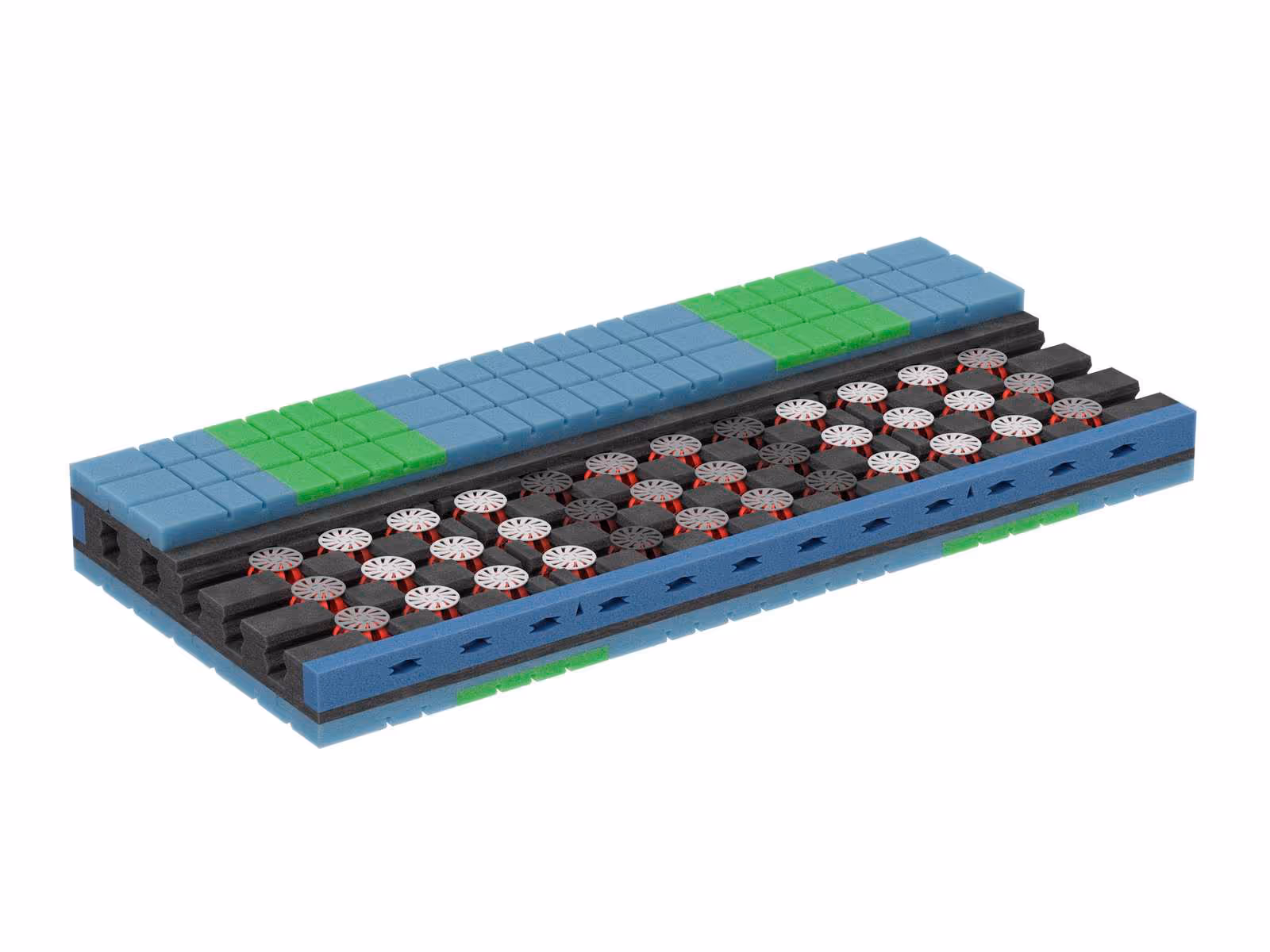 Kompromisslos hinsichtlich Klima und Durchlüftung. Wir setzen auf metallfreie TBS-Federn, die eine hohe Durchlüftung der Matratze sicherstellen. Zusätzlich sorgt ein dreidimensionales Belüftungssystem im Zusammenspiel mit dem Material EvoPoreHRC für ein perfektes Bettklima und eine ausgewogene Lagerung des Körpers. Besonders gutes Einsinken dank druckentlastender Schultereinleger. Verbessertes Ein-/Aussteigen dank verstärkter Seitenkante.
