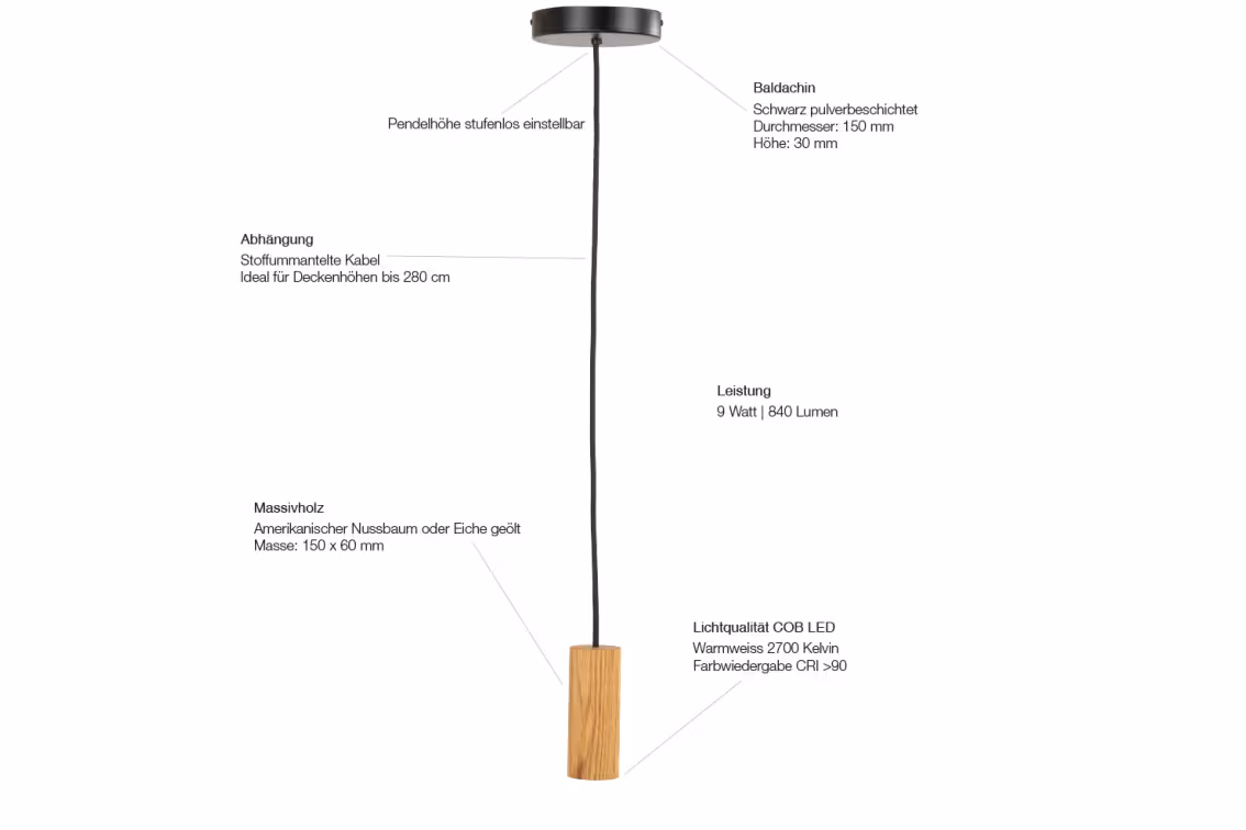 Die praktische Dimm Funktion (über Wanddimmer, nicht im Lieferumfang) machen die Lampe Mythen zu einer vielseitigen Beleuchtungslösung für verschiedene Räume und lässt sich zudem stufenlos einstellen in der Höhe: Die Gesamthöhe der Leuchte beträgt maximal 150 cm.