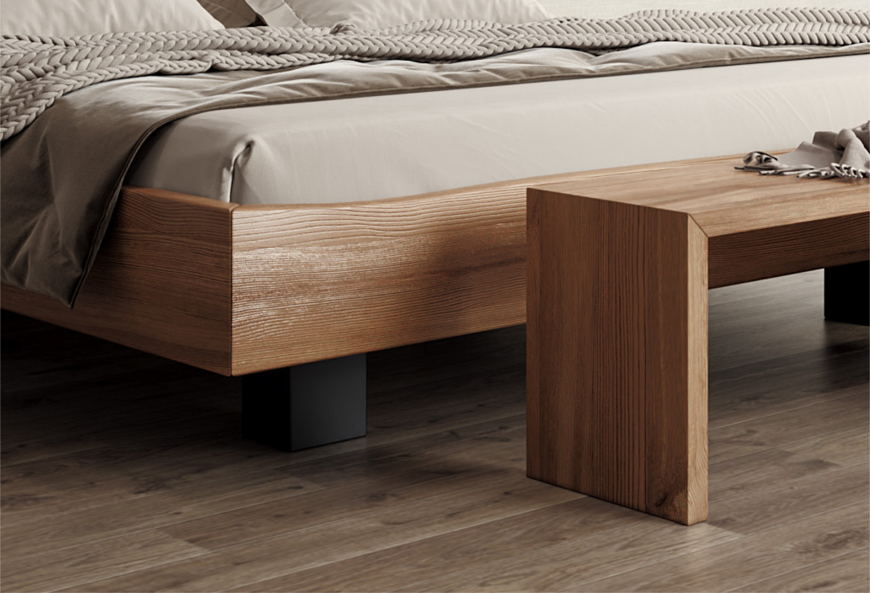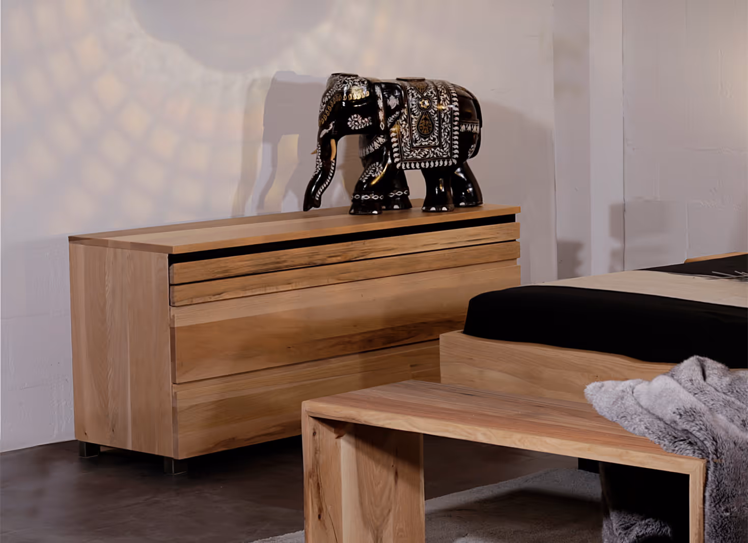 Bett in Sumpf-Eiche massiv geölt. Die über 100 Jahre gewachsenen Bäume haben die charakteristischen Risse und das lebendige Holzbild. Erhältlich ist das Bett für Matratzenbreiten 140, 160, 180 und 200 cm. Dazu passende Nachttische und Kommoden vervollständigen das Schlafzimmer.
