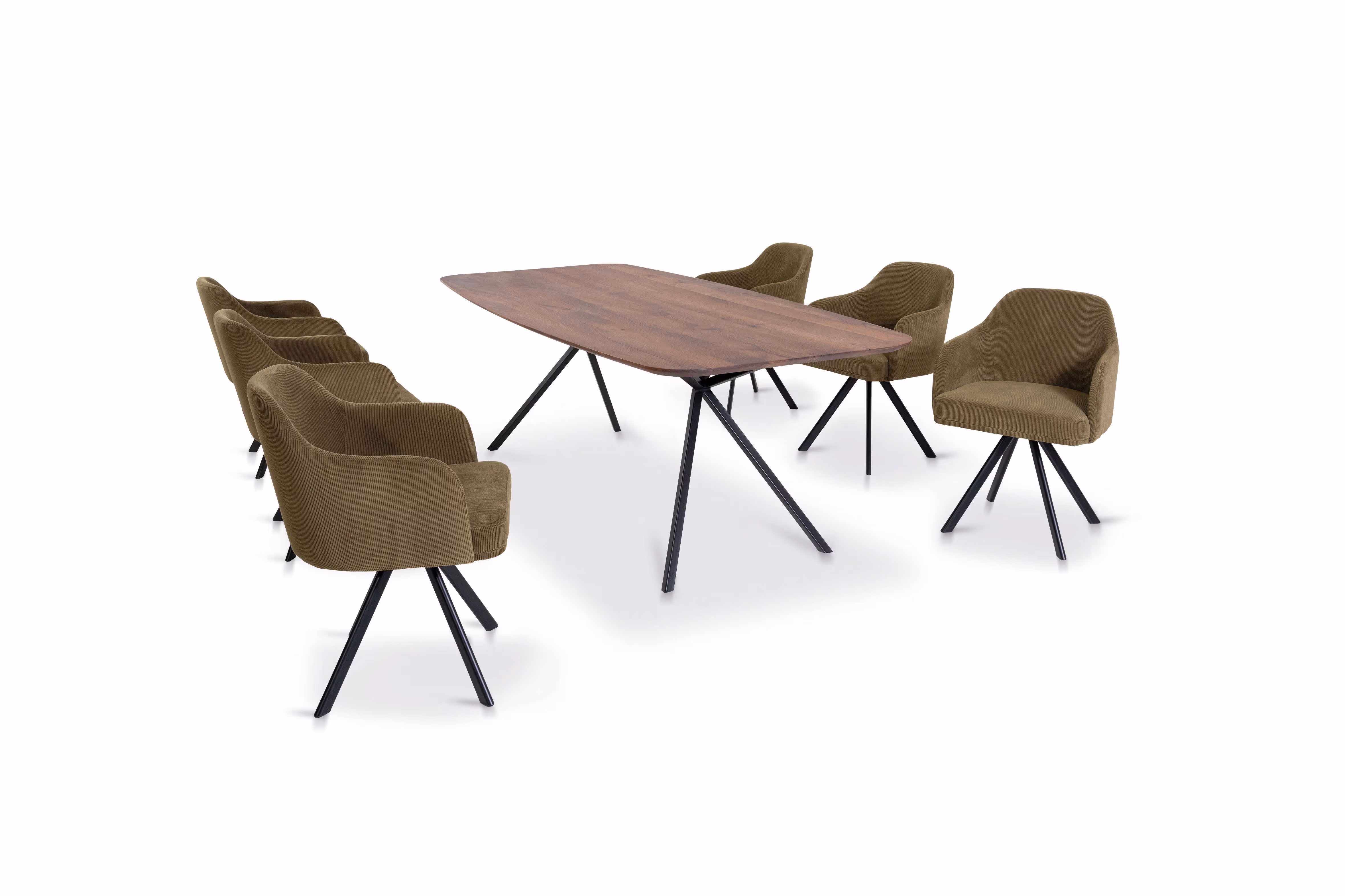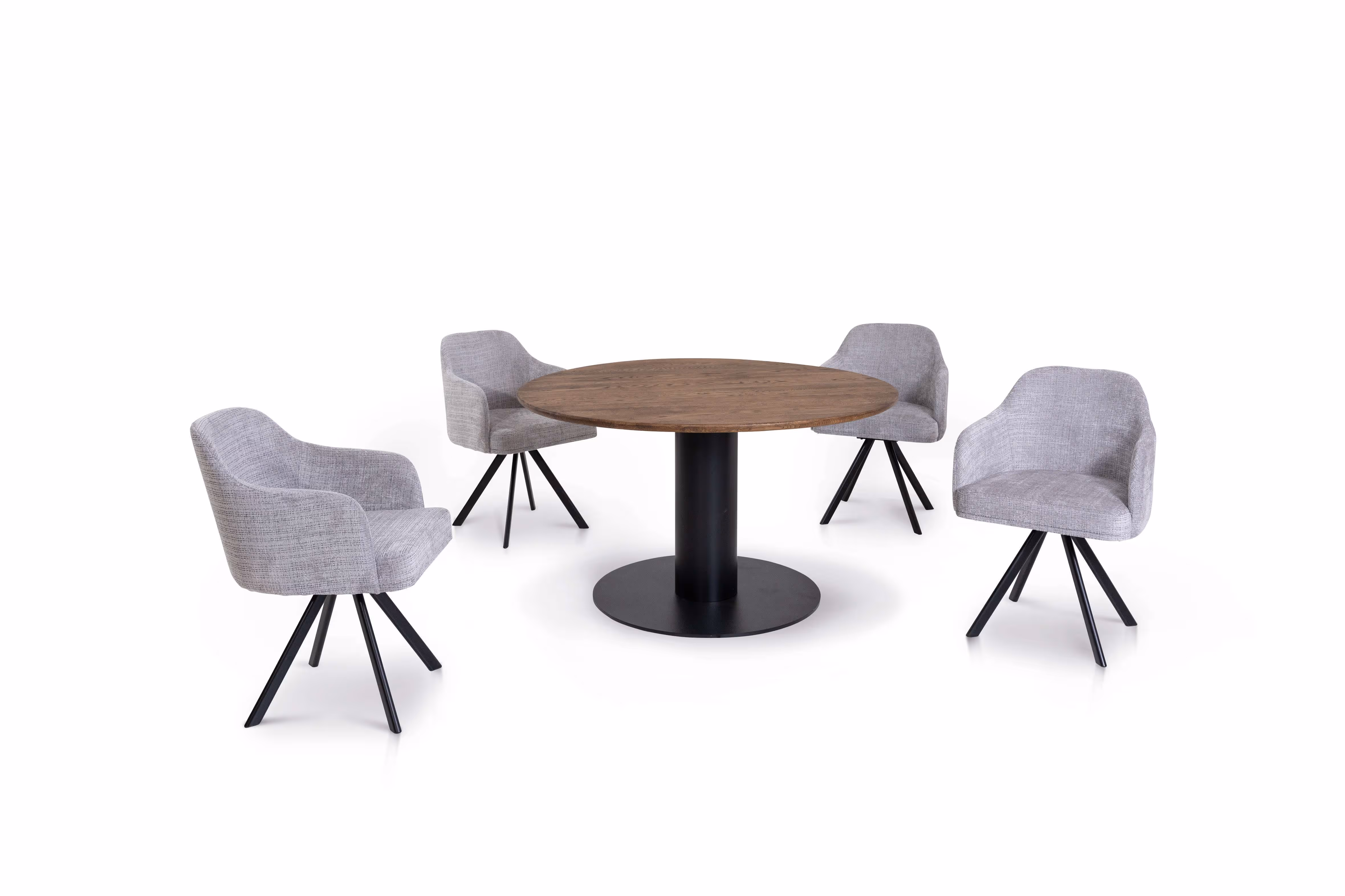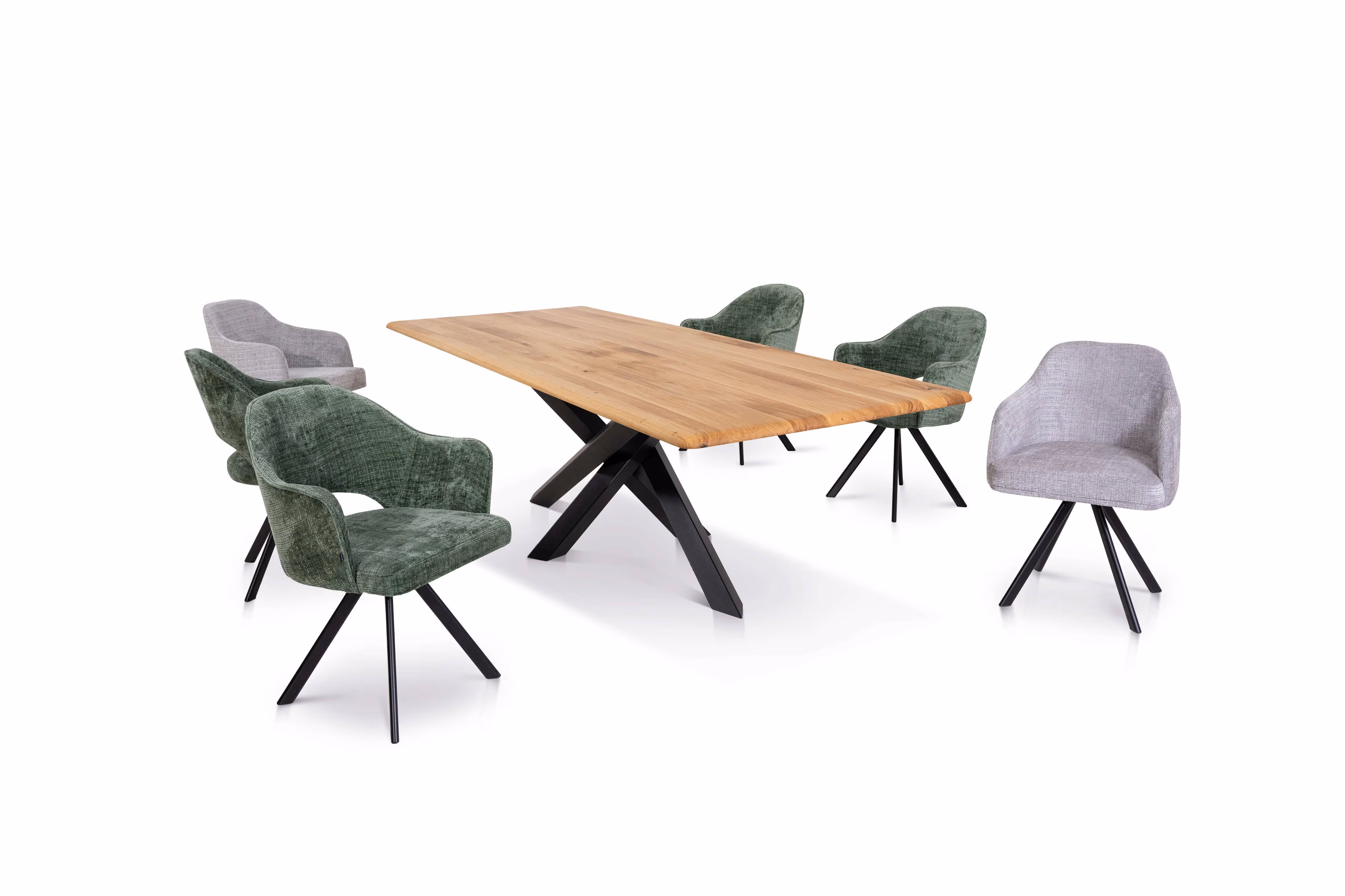 Kuscheln Sie sich gerne in diesen klassisch-modernen Stuhl mit den angenehmen Armteilen. Gerne zeigen wir Ihnen in unserer Ausstellung die Bezugsmöglichkeiten mit Original-Stoffmustern. Füsse sind in Metall schwarz lieferbar.