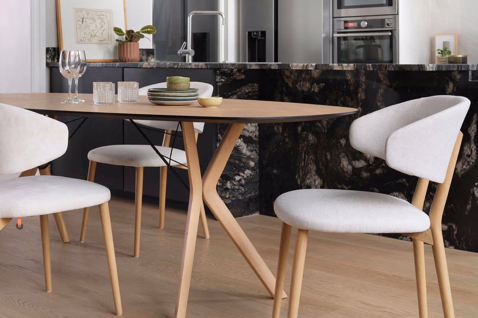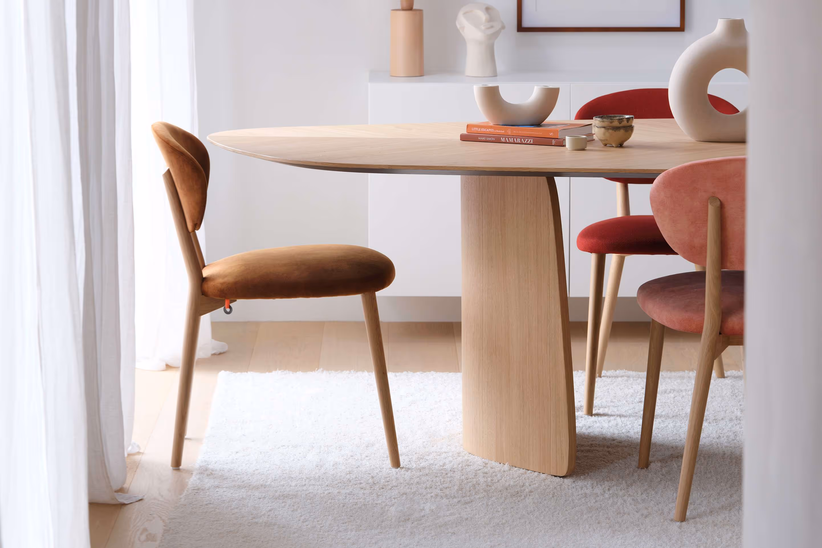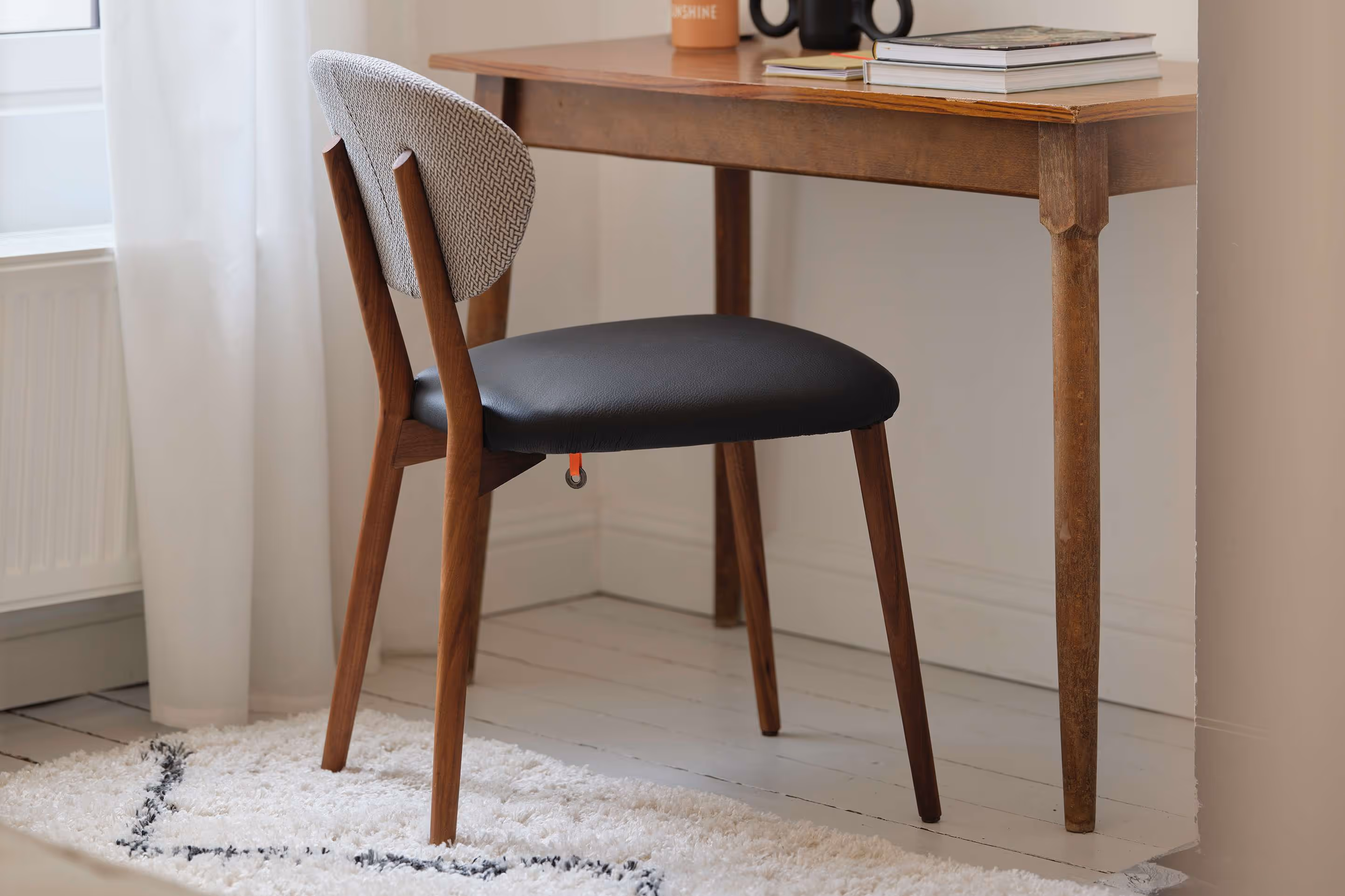 Dieser Stuhl hat zwei Gesichter: je nach Ihrer Wahl kann er über zwei unterschiedliche Farben oder sogar Materialien an Polsterbezügen verfügen. Die gebogene Rückenlehne, die gleichzeitig als Armlehne dient, sorgt mit einer Schaumstoffschicht für optimalen Sitzkomfort.