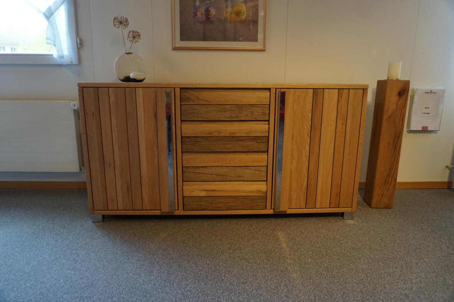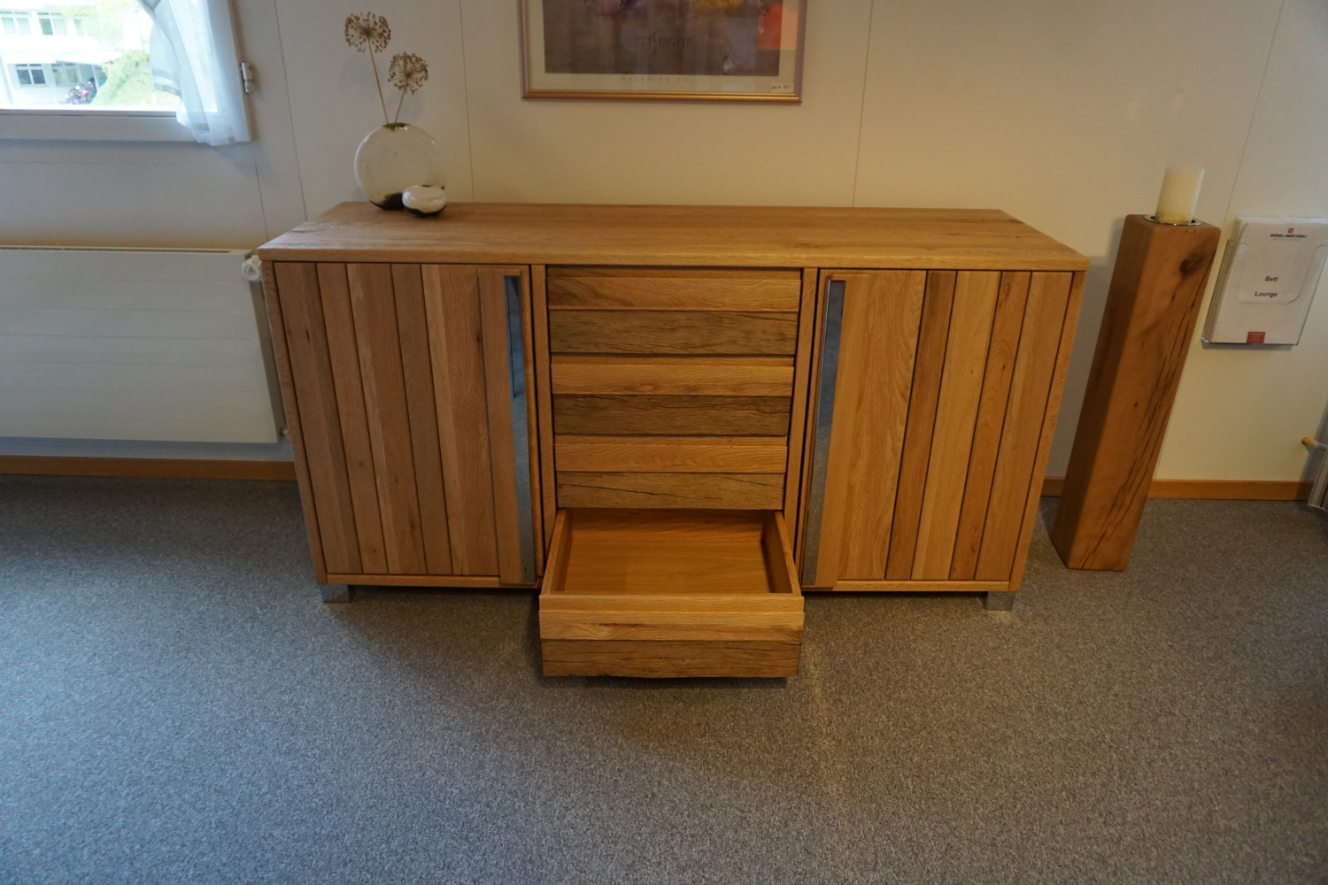 In Sumpfeiche natur, gebürstet2-türig mit 4 Schubladenmit je einem GlasfachbodenFüsse Eisen vernickelt